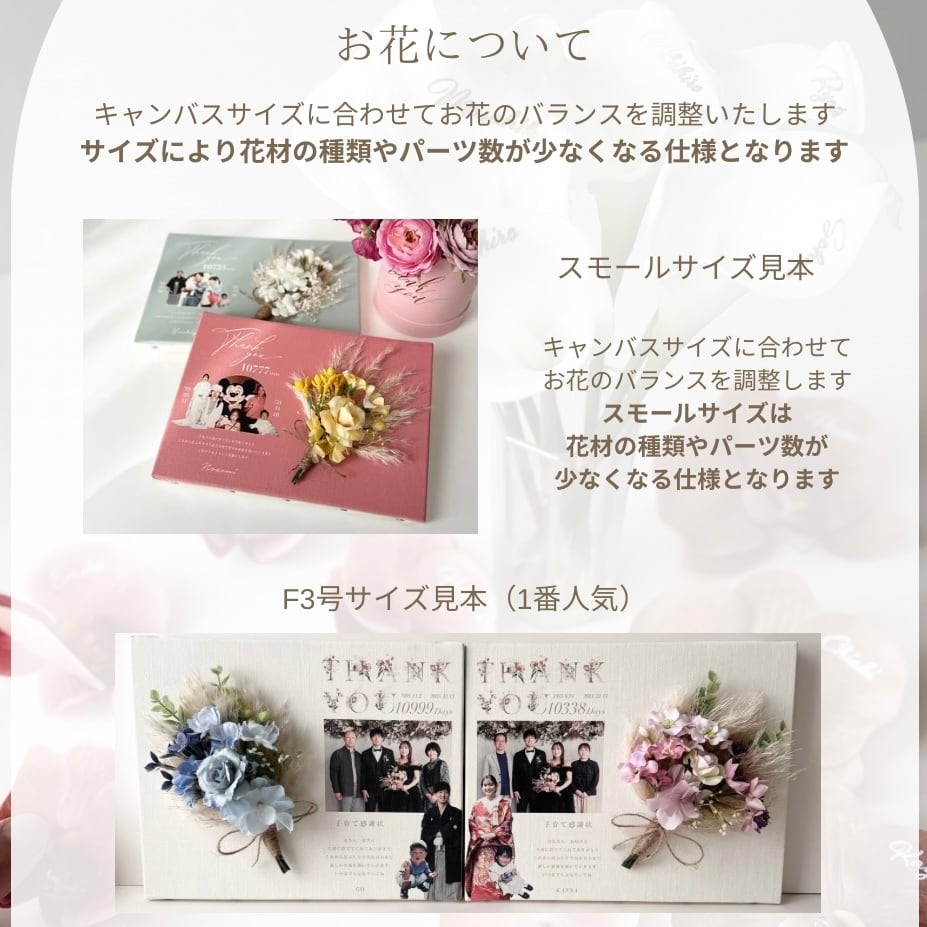 F3号(273mm×220mm×厚み18mm)→写真のサイズ。お花付きはF3号かF4号のみ。