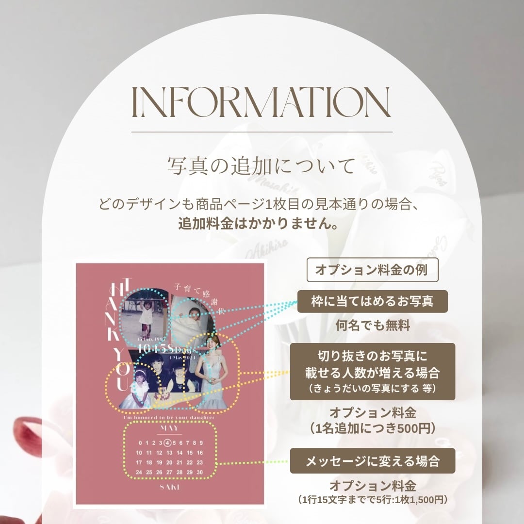 基本的には1枚の画像につき1名・合計3枚載せるかたちとなりますので、ご兄弟やご両親等、載せる人数が増える場合はオプション料金(1人追加につき+500円)でのご対応となります。